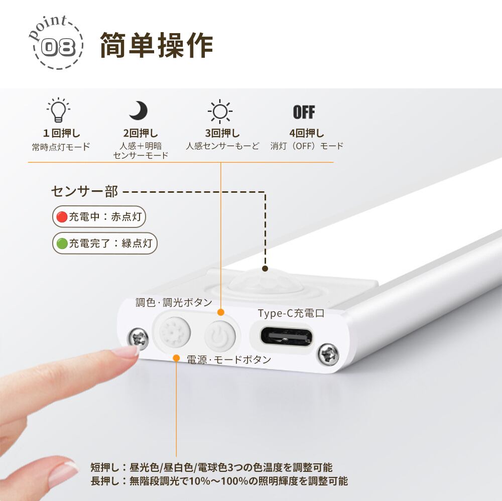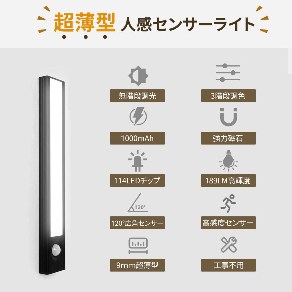 超薄型センサーライト 人感センサーライト 人感センサー ライト室内 センサーライト 室内 3段階調色 無段階調光 充電式 電池式 玄関 廊下 磁石マグネット フットライト 20cm/30cm/40cm/60cm 夜間ライト 階段ライト クロゼット