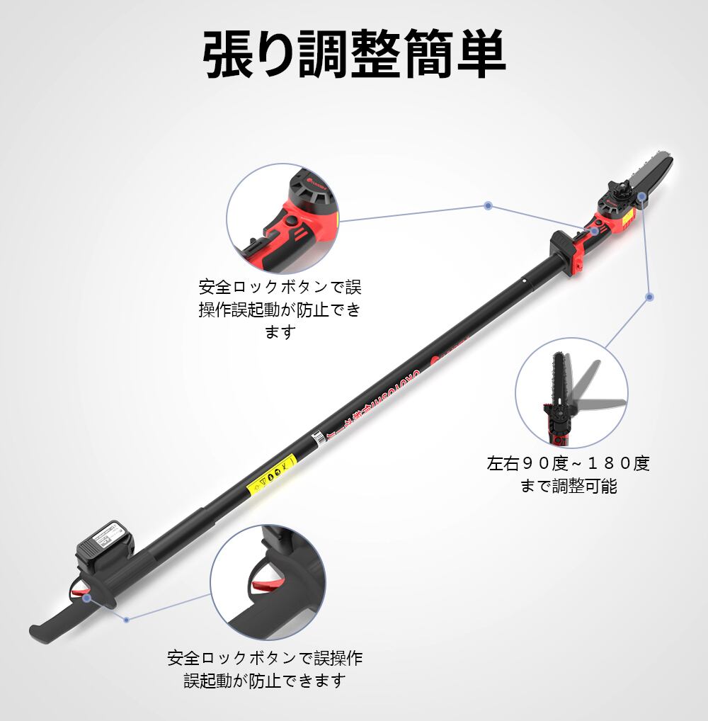 【付属品 】ポール(伸縮と普通選択可能)、充電器、バッテリー、手袋、チェーン*3、プラスチック製箱、チェーソオイル、日本語取扱説明書。